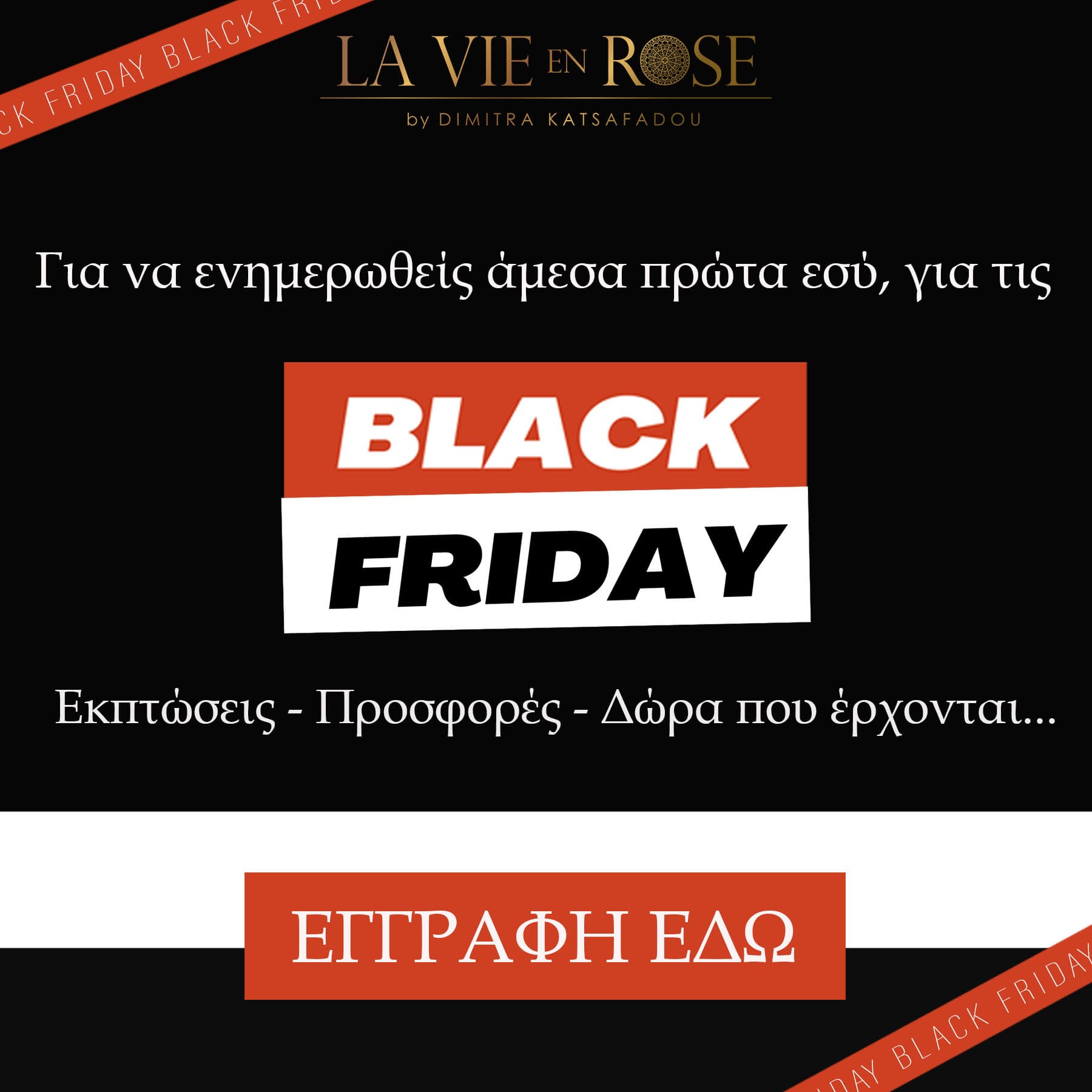 Μην περιμένεις άλλο... Κάνε Eγγραφή εδώ για να μάθεις πρώτα εσύ όλες τις Προσφορές και τις Εκπτώσεις αλλά και τα Δώρα της Δήμητρας Κατσαφάδου για την Black Friday.